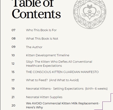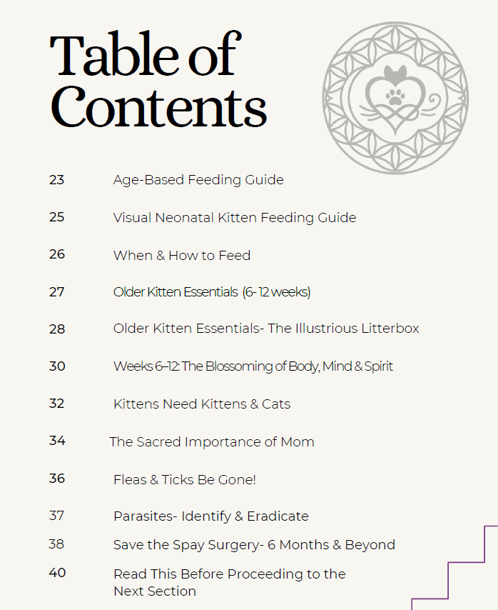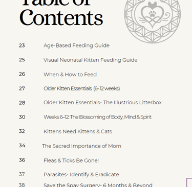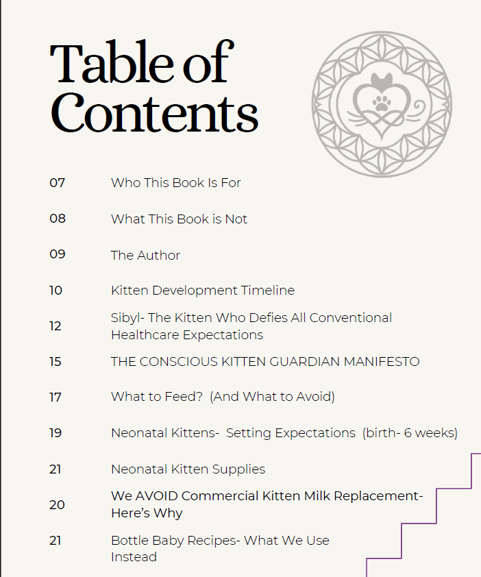 The full e-book covers multiple aspects of kitten development & wellness, including how to feed bottle babies and species-appropriate food guidelines you won't find in conventional care practices.